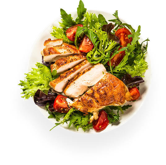 Green roman salad, chicken breast, beetroot, olive oil.
